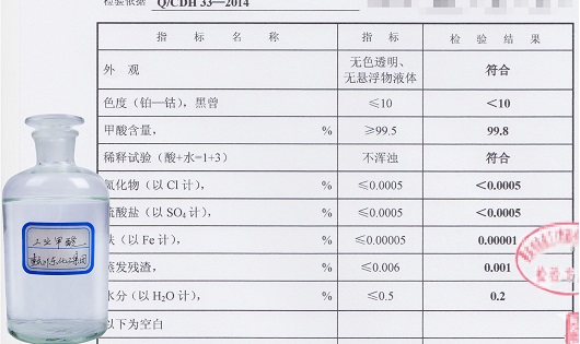 甲酸主含量≥85%,F(xiàn)e≤4ppm